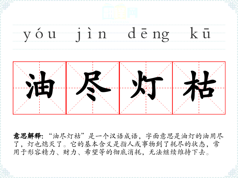 在**文化中,成语承载着丰富的历史和文化内涵。“油尽灯枯”体现了人们对于生命、精力和希望的看法,尤其在儒家文化中,强调节俭和持久力,也提醒人们在追求目标时要注重可持续性。在现代社会,随着竞争的加剧,关注心理健康和资源的合理利用变得越来越重要。