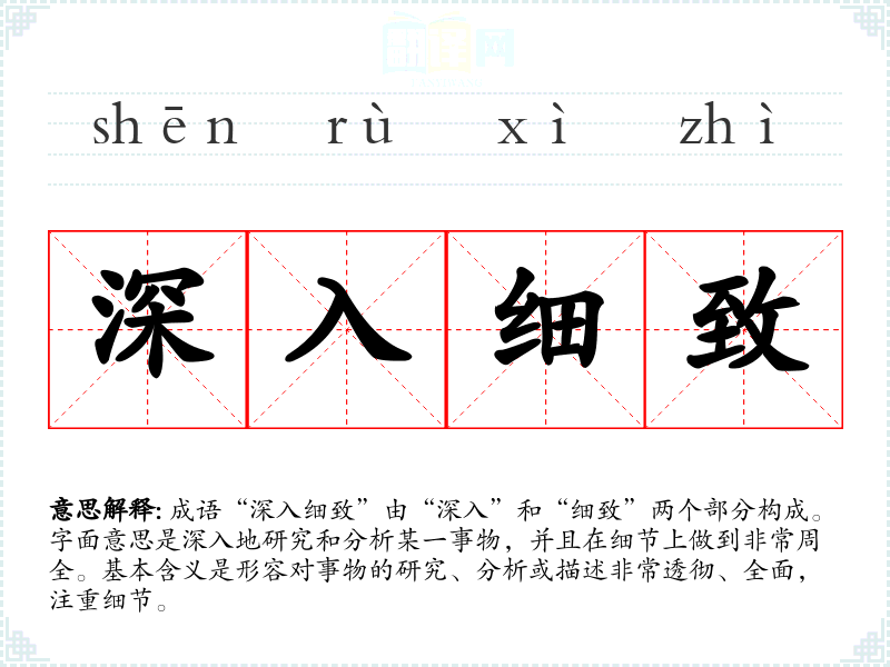 成语“深入细致”由“深入”和“细致”两个部分构成。字面意思是深入地研究和分析某一事物,并且在细节上做到非常周全。基本含义是形容对事物的研究、分析或描述非常透彻、全面,注重细节。
