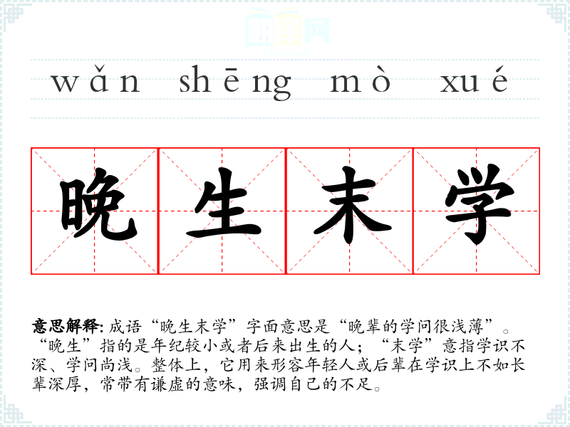 “晚生末学”出自清代文学家梁启超的文章。梁启超常用自谦的方式来表述自己的学识和经验,强调年轻人对前辈的敬重和学的态度。这一成语体现了传统文化中尊重长辈和重视学的思想。