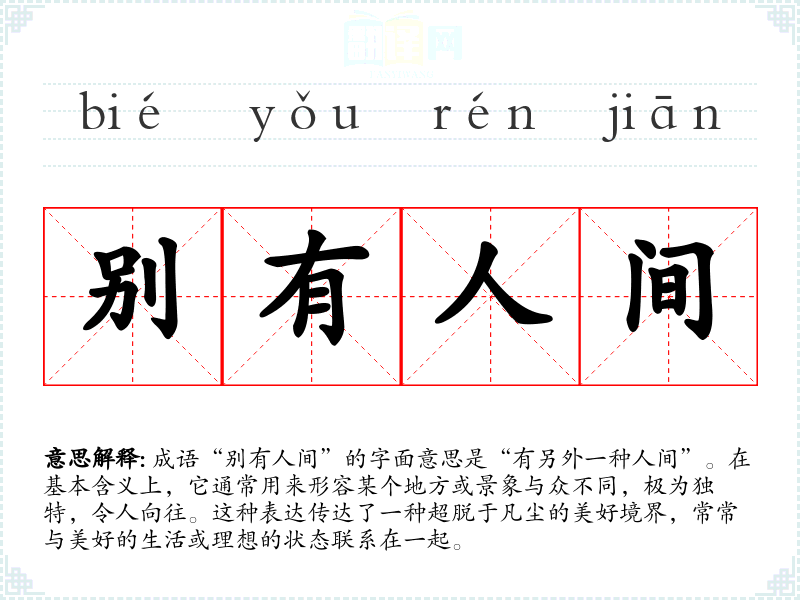 成语“别有人间”的字面意思是“有另外一种人间”。在基本含义上,它通常用来形容某个地方或景象与众不同,极为独特,令人向往。这种表达传达了一种超脱于凡尘的美好境界,常常与美好的生活或理想的状态联系在一起。