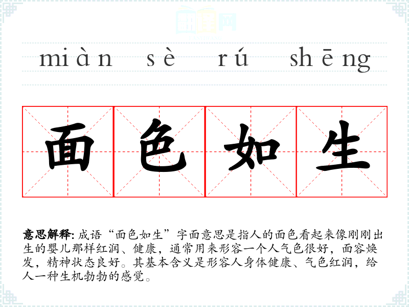 成语“面色如生”字面意思是指人的面色看起来像刚刚出生的婴儿那样红润、健康,通常用来形容一个人气色很好,面容焕发,精神状态良好。其基本含义是形容人身体健康、气色红润,给人一种生机勃勃的感觉。
