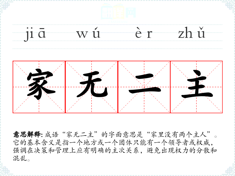 成语“家无二主”的字面意思是“家里没有两个主人”。它的基本含义是指一个地方或一个团体只能有一个领导者或权威,强调在决策和管理上应有明确的主次关系,避免出现权力的分散和混乱。