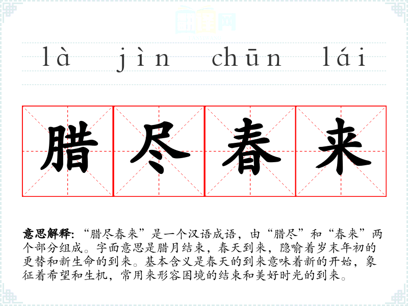 “腊尽春来”是一个汉语成语,由“腊尽”和“春来”两个部分组成。字面意思是腊月结束,春天到来,隐喻着岁末年初的更替和新生命的到来。基本含义是春天的到来意味着新的开始,象征着希望和生机,常用来形容困境的结束和美好时光的到来。