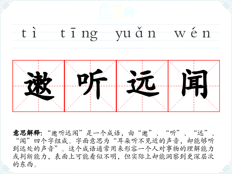 “遬听远闻”是一个成语,由“遬”、“听”、“远”、“闻”四个字组成。字面意思为“耳朵听不见近的声音,却能够听到远处的声音”。这个成语通常用来形容一个人对事物的理解能力或判断能力,表面上可能看似不明,但实际上却能洞察到更深层次的东西。