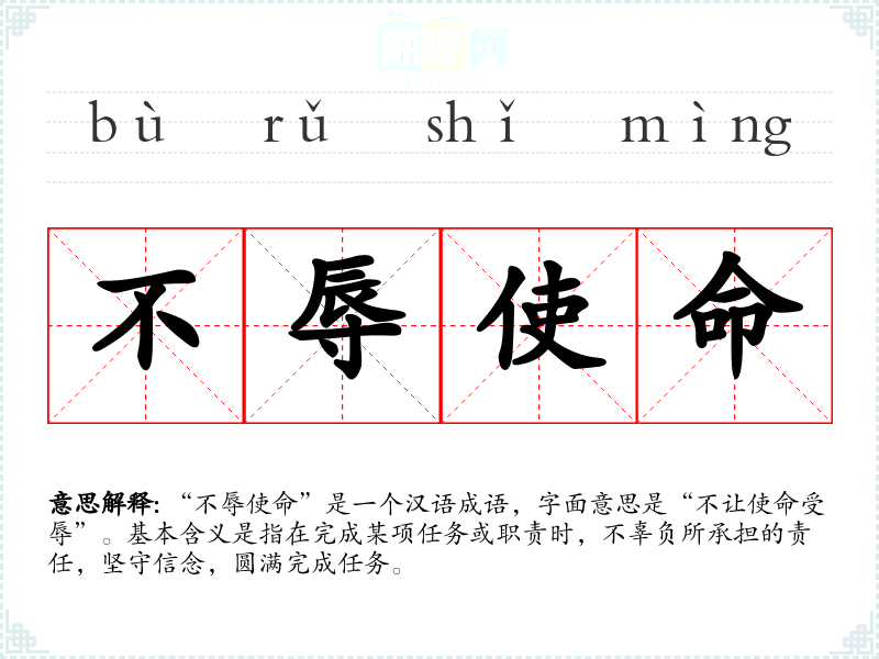 “不辱使命”是一个汉语成语,字面意思是“不让使命受辱”。基本含义是指在完成某项任务或职责时,不辜负所承担的责任,坚守信念,圆满完成任务。
