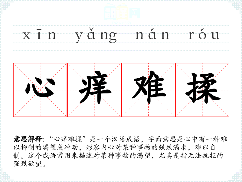 “心痒难揉”的成语来源并没有特定的历史典故,但其字面可以拆解为“心”和“痒”,隐喻着内心的冲动和欲望,类似于皮肤痒而无法忍耐的感觉。这个成语在古文和现代汉语中均可见,其使用频率较高,反映了人们对欲望和冲动的普遍体验。