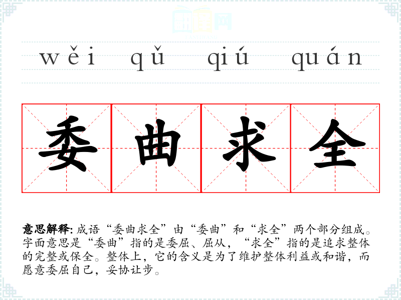 成语“委曲求全”由“委曲”和“求全”两个部分组成。字面意思是“委曲”指的是委屈、屈从,“求全”指的是追求整体的完整或保全。整体上,它的含义是为了维护整体利益或和谐,而愿意委屈自己,妥协让步。