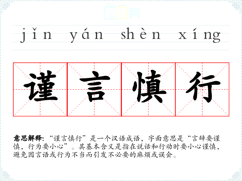“谨言慎行”是一个汉语成语,字面意思是“言辞要谨慎,行为要小心”。其基本含义是指在说话和行动时要小心谨慎,避免因言语或行为不当而引发不必要的麻烦或误会。