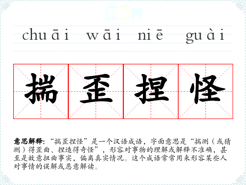 该成语的具体来源并不明确,但其构成的词汇“揣”、“歪”、“捏”和“怪”都在古代汉语中有着较为常见的用法。成语中的“揣”通常指揣测、猜测,“歪”则表示偏离或不正,“捏”意味着捏造或造假,而“怪”则通常与奇怪、异常相关。这个成语反映了对事实的不正当解读,可能与历史上某些典故或文学作品中对人性、真相的探讨有关。
