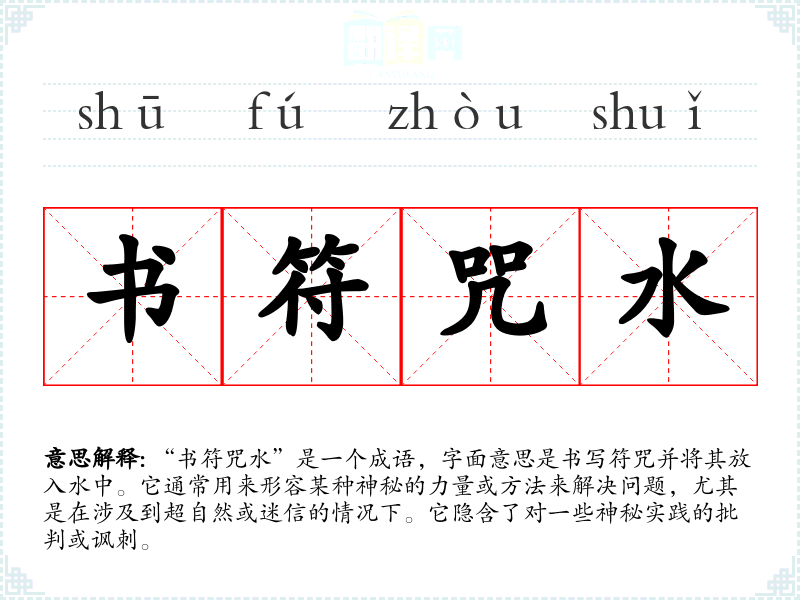 “书符咒水”是一个成语,字面意思是书写符咒并将其放入水中。它通常用来形容某种神秘的力量或方法来解决问题,尤其是在涉及到超自然或迷信的情况下。它隐含了对一些神秘实践的批判或讽刺。
