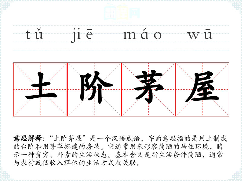 该成语的来源并不明确,但它反映了**传统社会中对居住环境和生活水平的观察。土阶和茅屋是古代农村常见的建筑形式,象征着一种质朴而艰苦的生活。这种居住条件在古代农民的生活中十分常见,因而成语的使用可能源于对这种生活状态的描述。