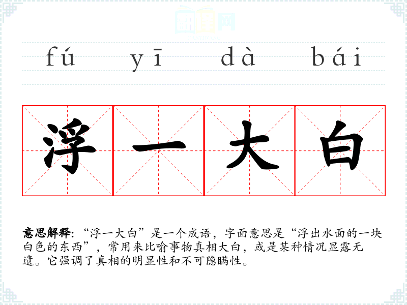 “浮一大白”是一个成语,字面意思是“浮出水面的一块白色的东西”,常用来比喻事物真相大白,或是某种情况显露无遗。它强调了真相的明显性和不可隐瞒性。