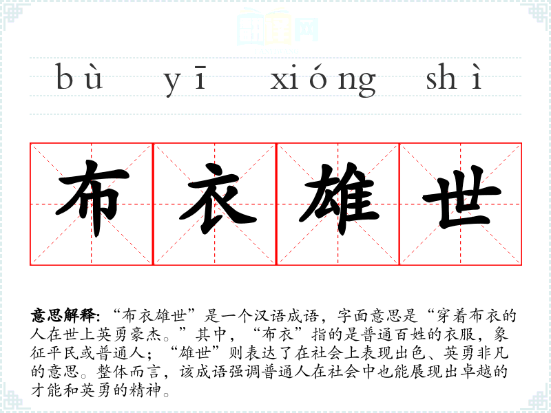 “布衣雄世”是一个汉语成语,字面意思是“穿着布衣的人在世上英勇豪杰。”其中,“布衣”指的是普通百姓的衣服,象征平民或普通人;“雄世”则表达了在社会上表现出色、英勇非凡的意思。整体而言,该成语强调普通人在社会中也能展现出卓越的才能和英勇的精神。