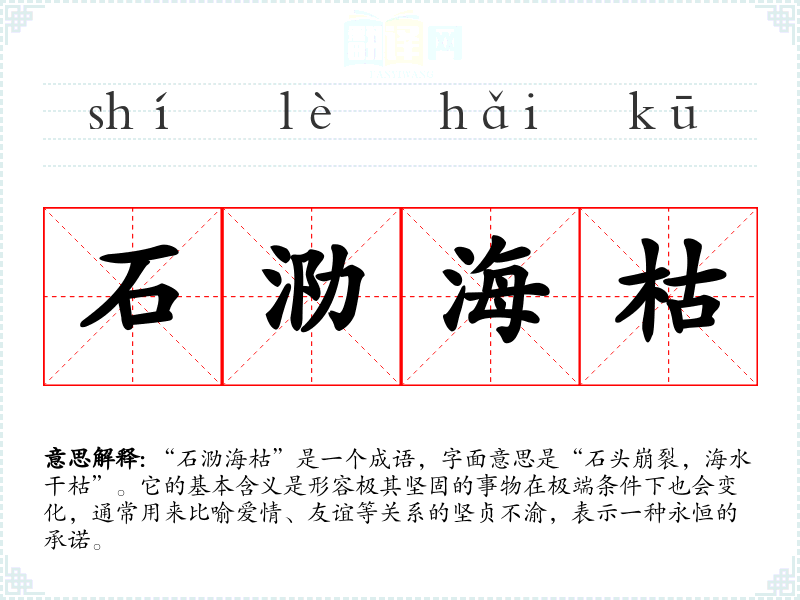 “石泐海枯”是一个成语,字面意思是“石头崩裂,海水干枯”。它的基本含义是形容极其坚固的事物在极端条件下也会变化,通常用来比喻爱情、友谊等关系的坚贞不渝,表示一种永恒的承诺。