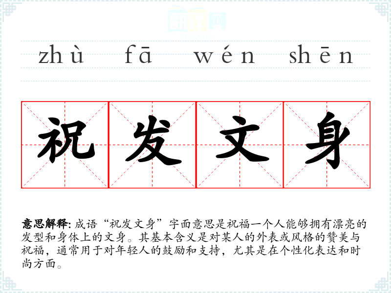 成语“祝发文身”字面意思是祝福一个人能够拥有漂亮的发型和身体上的文身。其基本含义是对某人的外表或风格的赞美与祝福,通常用于对年轻人的鼓励和支持,尤其是在个性化表达和时尚方面。