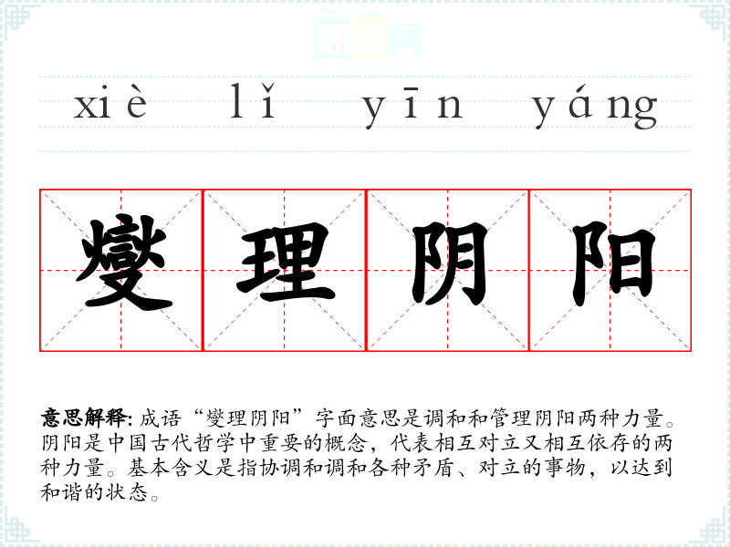 | 燮理阴阳 | 燮:调和;理:治理。指大臣辅佐天子治理国事。 |