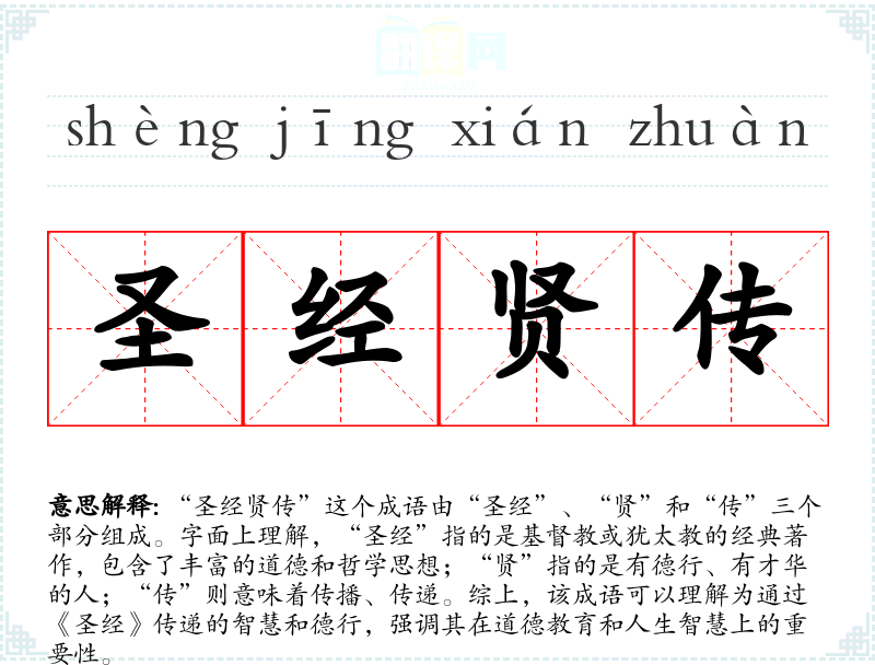 “圣经贤传”这个成语由“圣经”、“贤”和“传”三个部分组成。字面上理解,“圣经”指的是**教或犹太教的经典著作,包含了丰富的道德和哲学思想;“贤”指的是有德行、有才华的人;“传”则意味着传播、传递。综上,该成语可以理解为通过《圣经》传递的智慧和德行,强调其在道德教育和人生智慧上的重要性。