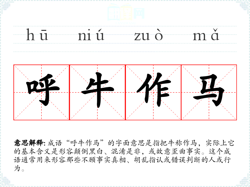 成语“呼牛作马”的字面意思是指把牛称作马,实际上它的基本含义是形容颠倒黑白、混淆是非,或故意歪曲事实。这个成语通常用来形容那些不顾事实真相、胡乱指认或错误判断的人或行为。