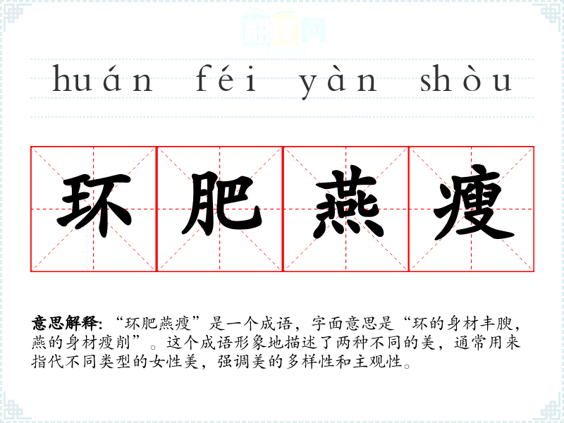 - 反义成语:一模一样、千篇一律。与“环肥燕瘦”相对,这些成语强调了单一性和缺乏变化。
