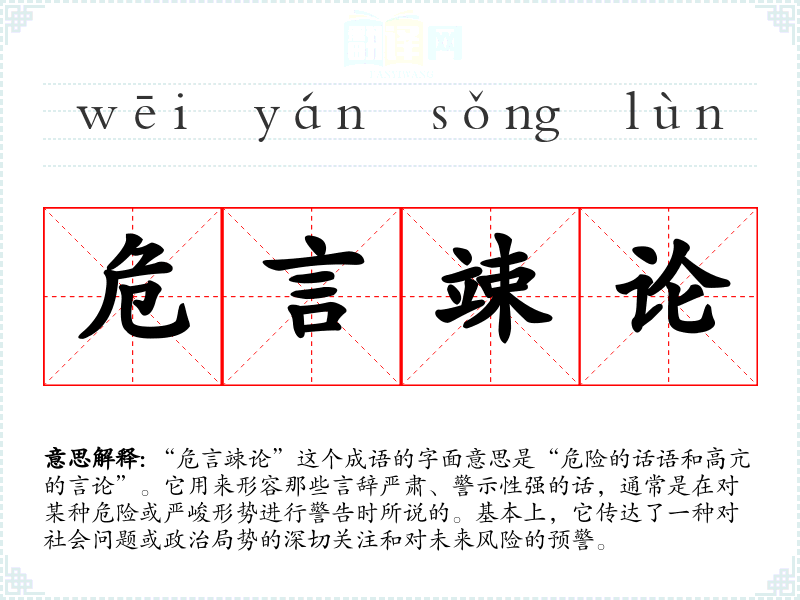 “危言竦论”这个成语的字面意思是“危险的话语和高亢的言论”。它用来形容那些言辞严肃、警示性强的话,通常是在对某种危险或严峻形势进行警告时所说的。基本上,它传达了一种对社会问题或政治局势的深切关注和对未来风险的预警。