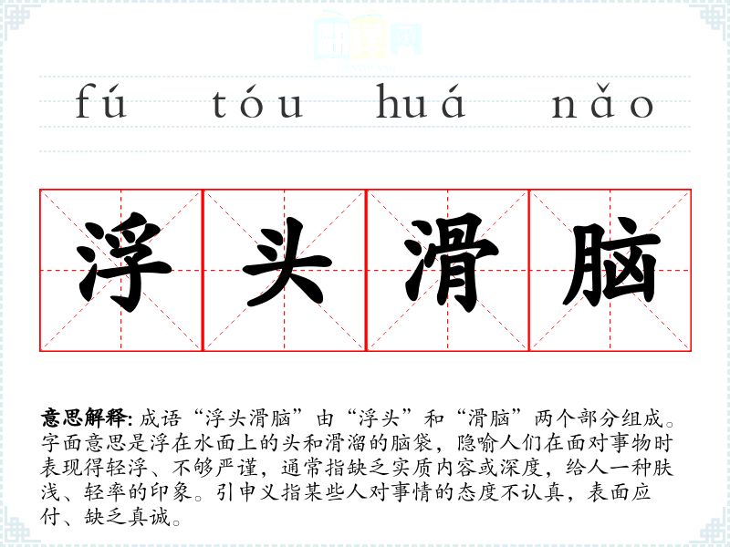 成语“浮头滑脑”由“浮头”和“滑脑”两个部分组成。字面意思是浮在水面上的头和滑溜的脑袋,隐喻人们在面对事物时表现得轻浮、不够严谨,通常指缺乏实质内容或深度,给人一种肤浅、轻率的印象。引申义指某些人对事情的态度不认真,表面应付、缺乏真诚。