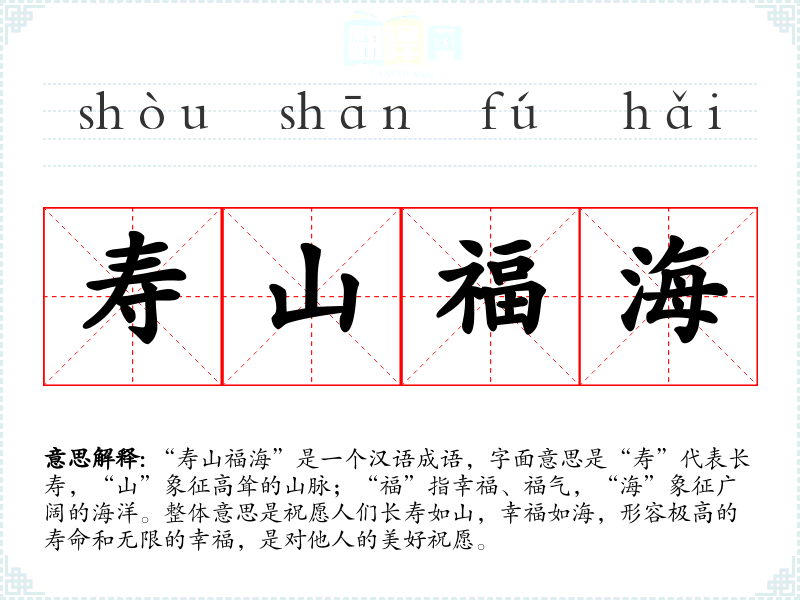 “寿山福海”是一个汉语成语,字面意思是“寿”代表长寿,“山”象征高耸的山脉;“福”指幸福、福气,“海”象征广阔的海洋。整体意思是祝愿人们长寿如山,幸福如海,形容极高的寿命和无限的幸福,是对他人的美好祝愿。