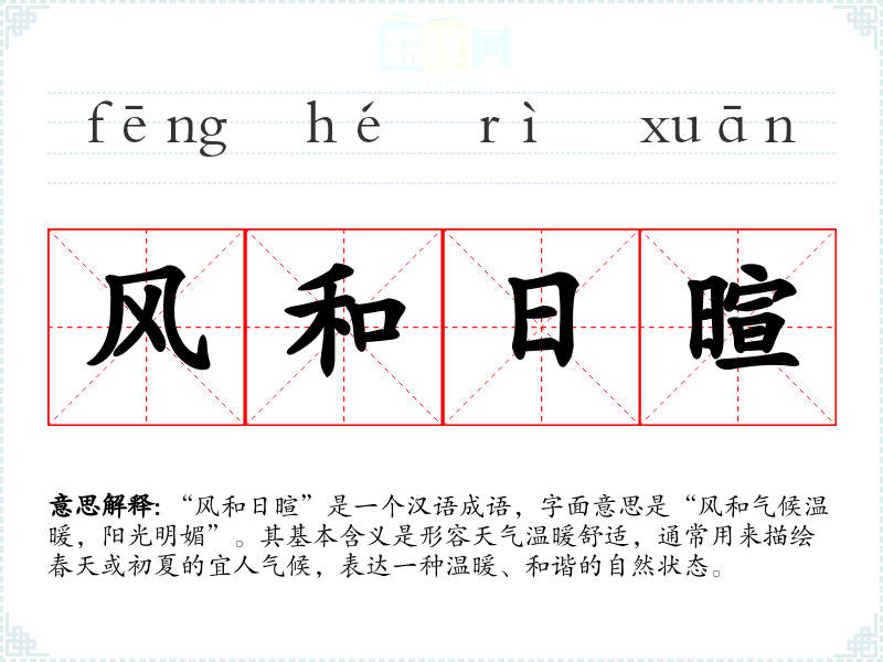 “风和日暄”是一个汉语成语,字面意思是“风和气候温暖,阳光明媚”。其基本含义是形容天气温暖舒适,通常用来描绘春天或初夏的宜人气候,表达一种温暖、和谐的自然状态。