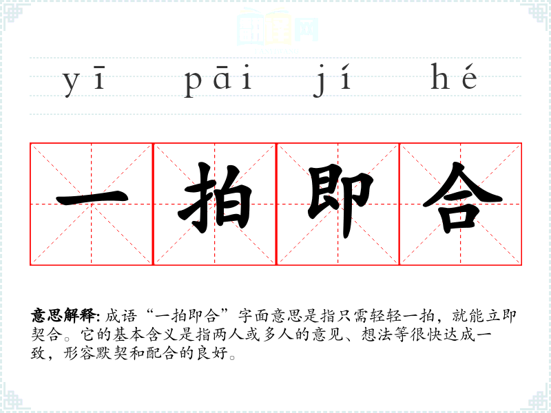 成语“一拍即合”字面意思是指只需轻轻一拍,就能立即契合。它的基本含义是指两人或多人的意见、想法等很快达成一致,形容默契和配合的良好。