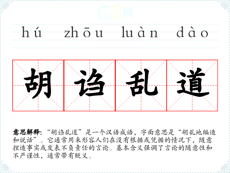 该成语的具体来源并没有明确的历史记载,但“胡”字在古代常用于表示不正当或不真实的事物,而“诌”和“乱道”则更进一步强调了随意和不负责任的态度。成语的形成与**传统文化中对言语责任的重视有密切关系,尤其是在辩论、学术和道德讨论中,强调真实和严谨的表达。