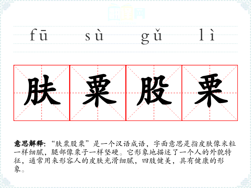 “肤粟股栗”是一个汉语成语,字面意思是指皮肤像米粒一样细腻,腿部像栗子一样坚硬。它形象地描述了一个人的外貌特征,通常用来形容人的皮肤光滑细腻,四肢健美,具有健康的形象。
