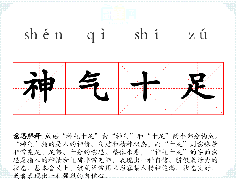 成语“神气十足”由“神气”和“十足”两个部分构成。“神气”指的是人的神情、气质和精神状态,而“十足”则意味着非常充足、足够、十分的意思。整体来看,“神气十足”的字面意思是指人的神情和气质非常充沛,表现出一种自信、骄傲或活力的状态。基本含义上,该成语常用来形容某人精神饱满、状态良好,或者表现出一种强烈的自信心。
