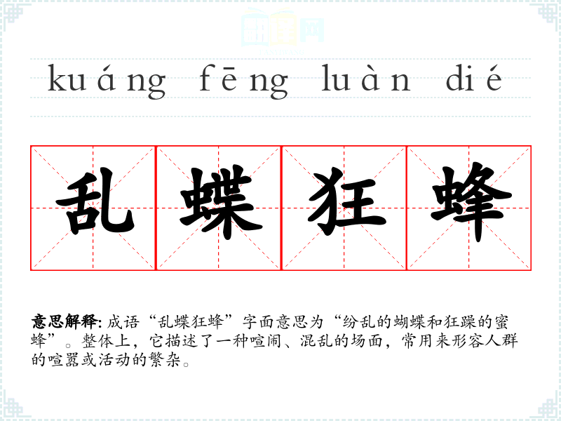 成语“乱蝶狂蜂”字面意思为“纷乱的蝴蝶和狂躁的蜜蜂”。整体上,它描述了一种喧闹、混乱的场面,常用来形容人群的喧嚣或活动的繁杂。
