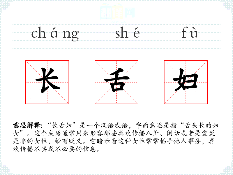 “长舌妇”是一个汉语成语,字面意思是指“舌头长的妇女”。这个成语通常用来形容那些喜欢传播八卦、闲话或者是爱说是非的女性,带有贬义。它暗示着这种女性常常插手他人事务,喜欢传播不实或不必要的信息。