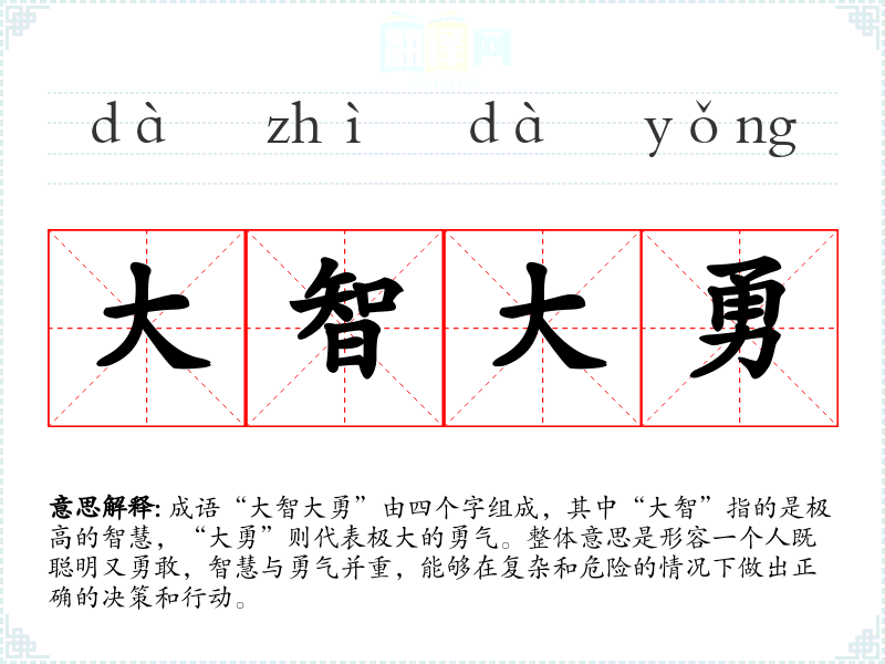 成语“大智大勇”由四个字组成,其中“大智”指的是极高的智慧,“大勇”则代表极大的勇气。整体意思是形容一个人既聪明又勇敢,智慧与勇气并重,能够在复杂和危险的情况下做出正确的决策和行动。