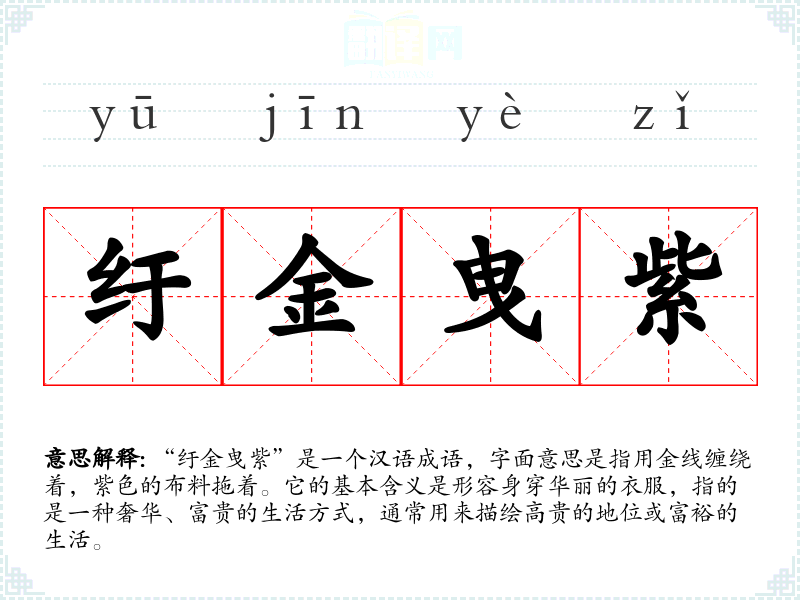 “纡金曳紫”是一个汉语成语,字面意思是指用金线缠绕着,紫色的布料拖着。它的基本含义是形容身穿华丽的衣服,指的是一种奢华、富贵的生活方式,通常用来描绘高贵的地位或富裕的生活。