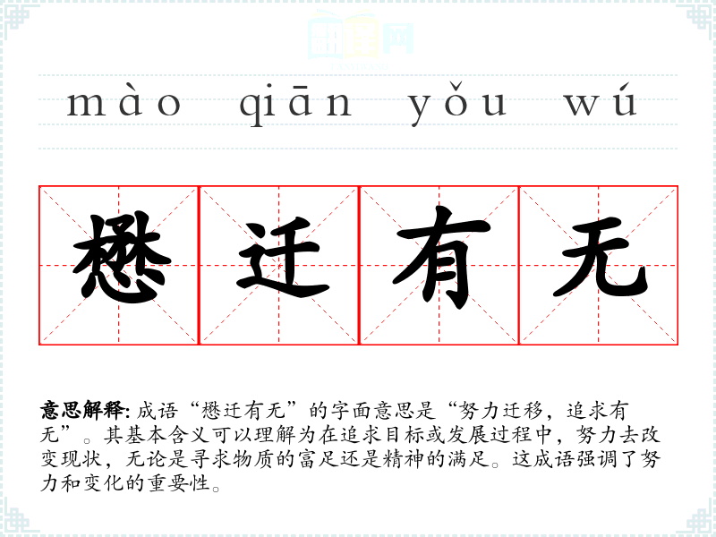 成语“懋迁有无”的字面意思是“努力迁移,追求有无”。其基本含义可以理解为在追求目标或发展过程中,努力去改变现状,无论是寻求物质的富足还是精神的满足。这成语强调了努力和变化的重要性。