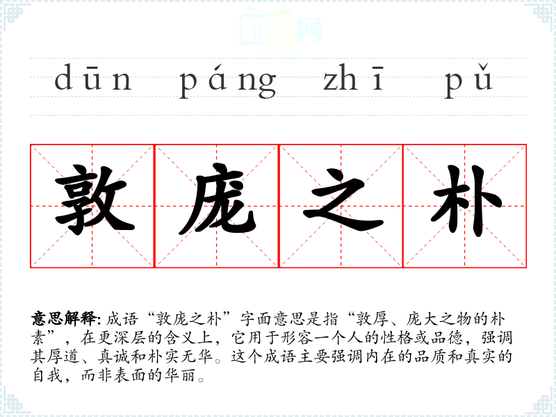 成语“敦庞之朴”字面意思是指“敦厚、庞大之物的朴素”,在更深层的含义上,它用于形容一个人的性格或品德,强调其厚道、真诚和朴实无华。这个成语主要强调内在的品质和真实的自我,而非表面的华丽。