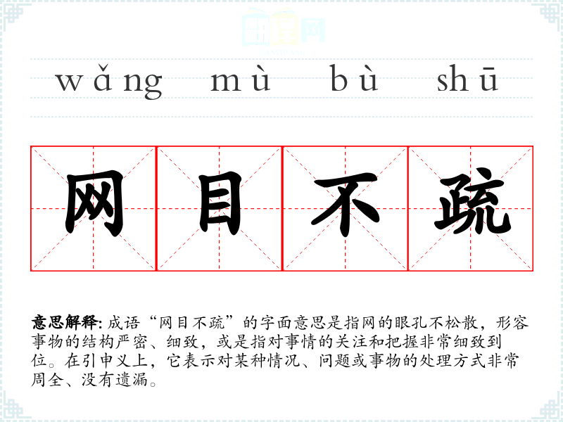 成语“网目不疏”的字面意思是指网的眼孔不松散,形容事物的结构严密、细致,或是指对事情的关注和把握非常细致到位。在引申义上,它表示对某种情况、问题或事物的处理方式非常周全、没有遗漏。
