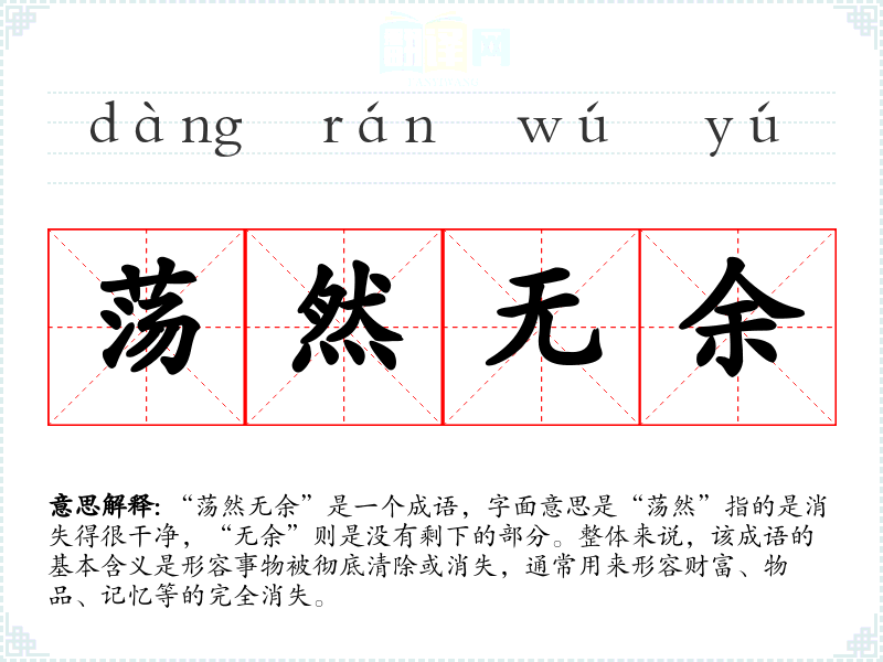 “荡然无余”是一个成语,字面意思是“荡然”指的是消失得很干净,“无余”则是没有剩下的部分。整体来说,该成语的基本含义是形容事物被彻底清除或消失,通常用来形容财富、物品、记忆等的完全消失。
