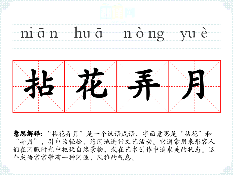 “拈花弄月”是一个汉语成语,字面意思是“拈花”和“弄月”,引申为轻松、悠闲地进行文艺活动。它通常用来形容人们在闲暇时光中把玩自然景物,或在艺术创作中追求美的状态。这个成语常常带有一种闲适、风雅的气息。