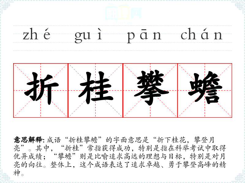 成语“折桂攀蟾”的字面意思是“折下桂花,攀登月亮”。其中,“折桂”常指获得成功,特别是指在科举考试中取得优异成绩;“攀蟾”则是比喻追求高远的理想与目标,特别是对月亮的向往。整体上,这个成语表达了追求卓越、勇于攀登高峰的精神。