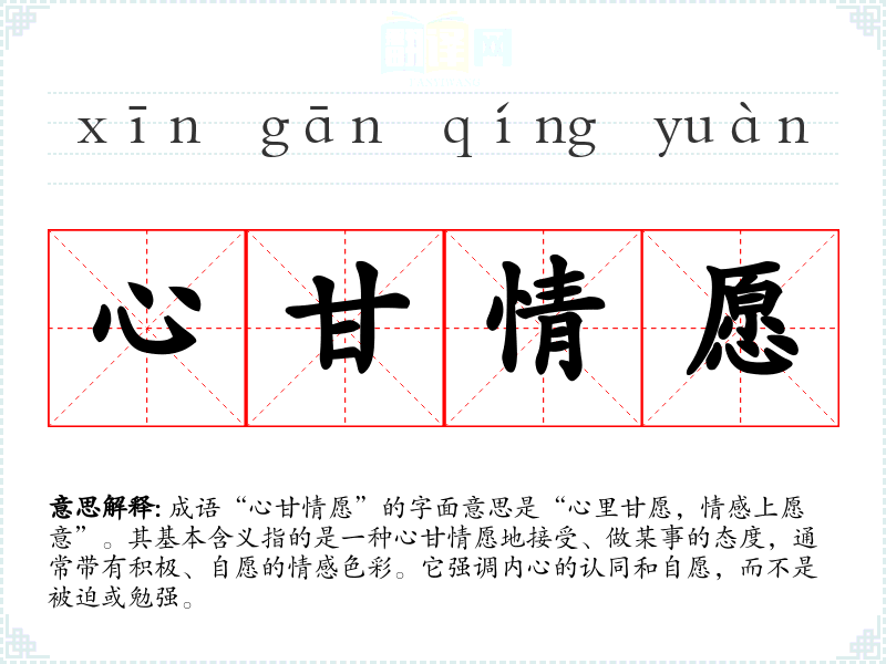 在**文化中,“心甘情愿”体现了自愿奉献和内心认同的美德,常用于描述家庭、友情和爱情等亲密关系中的相互付出。在现代社会,这个成语依然适用,尤其在志愿服务、慈善活动及个人成长中,强调了自我选择的重要性。
