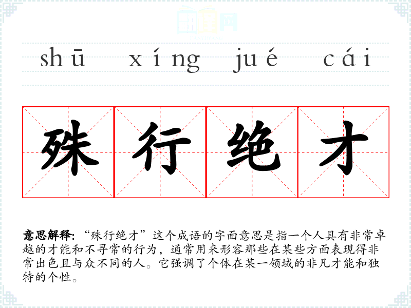 “殊行绝才”这个成语的字面意思是指一个人具有非常卓越的才能和不寻常的行为,通常用来形容那些在某些方面表现得非常出色且与众不同的人。它强调了个体在某一领域的非凡才能和独特的个性。