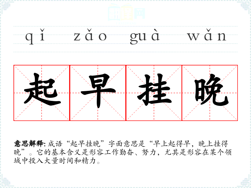 成语“起早挂晚”字面意思是“早上起得早,晚上挂得晚”。它的基本含义是形容工作勤奋、努力,尤其是形容在某个领域中投入大量时间和精力。
