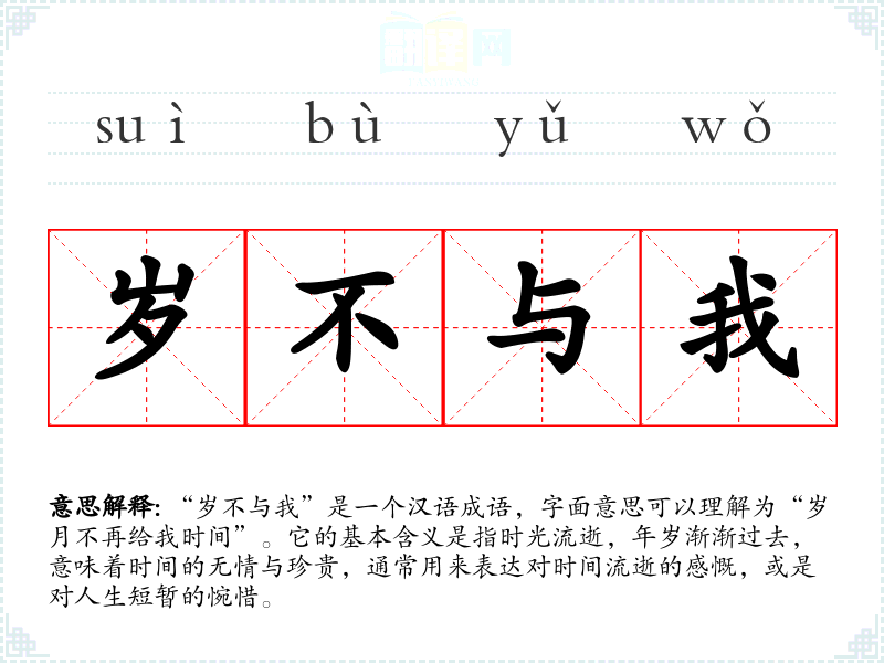 “岁不与我”是一个汉语成语,字面意思可以理解为“岁月不再给我时间”。它的基本含义是指时光流逝,年岁渐渐过去,意味着时间的无情与珍贵,通常用来表达对时间流逝的感慨,或是对人生短暂的惋惜。
