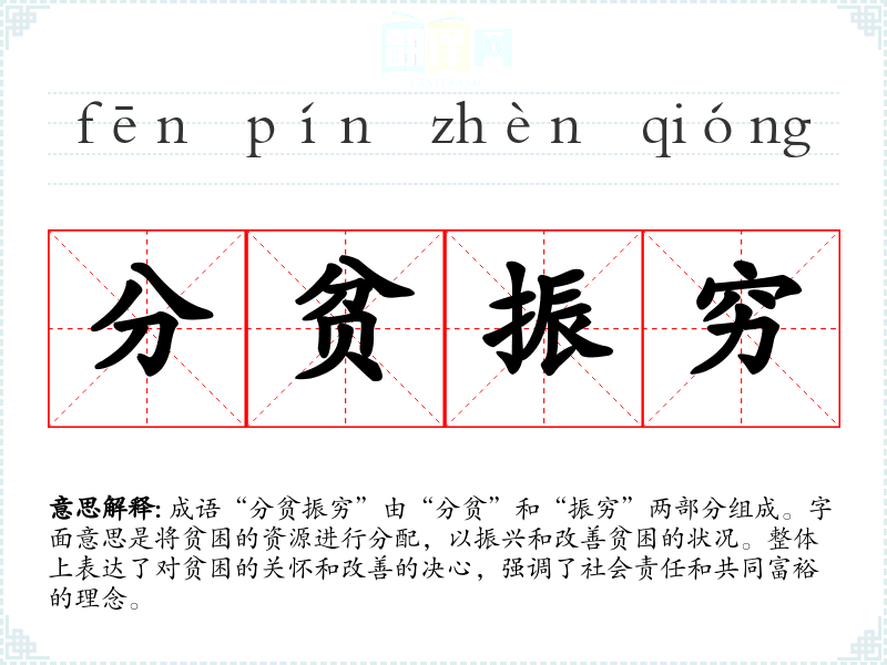 成语“分贫振穷”由“分贫”和“振穷”两部分组成。字面意思是将贫困的资源进行分配,以振兴和改善贫困的状况。整体上表达了对贫困的关怀和改善的决心,强调了社会责任和共同富裕的理念。