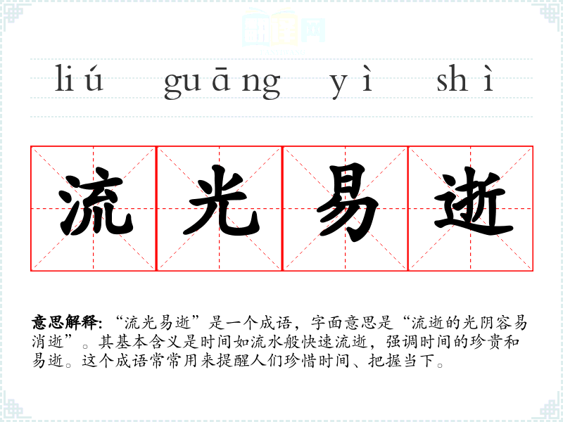 “流光易逝”出自古代诗词,尤其是与时间、生命相关的文学作品中。虽然该成语的具体出处较难追溯,但它与许多古代诗人的感慨相呼应,如李白、杜甫等人在诗中常常表达对时间流逝的感伤。反映了古人重视时间、生命短暂的哲学思考。