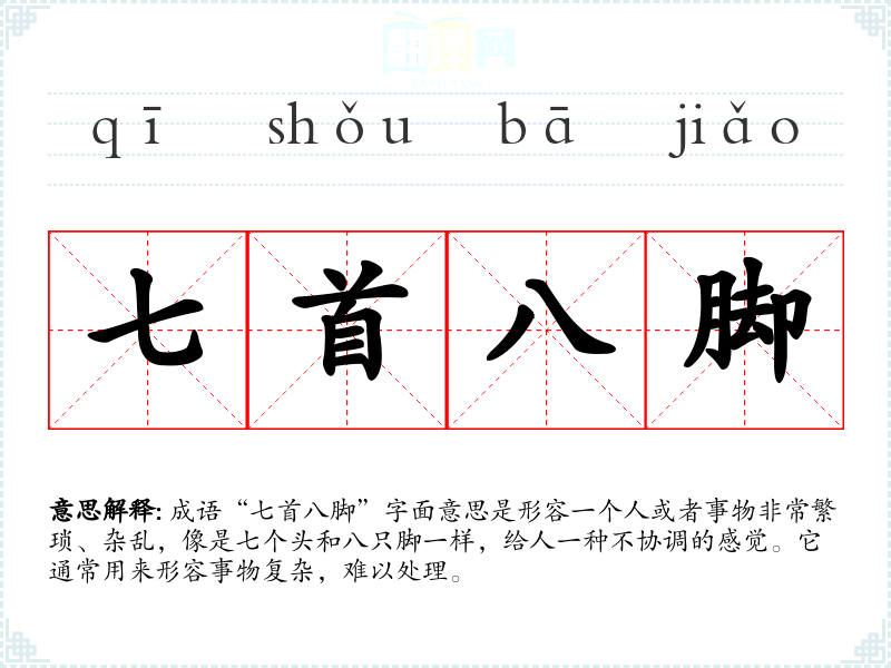 “七首八脚”给人一种无奈和烦躁的感觉,常常联想到生活中的琐事和复杂的关系。它提醒我们在面对繁杂事务时,需要保持冷静和理智,寻找解决的方法。