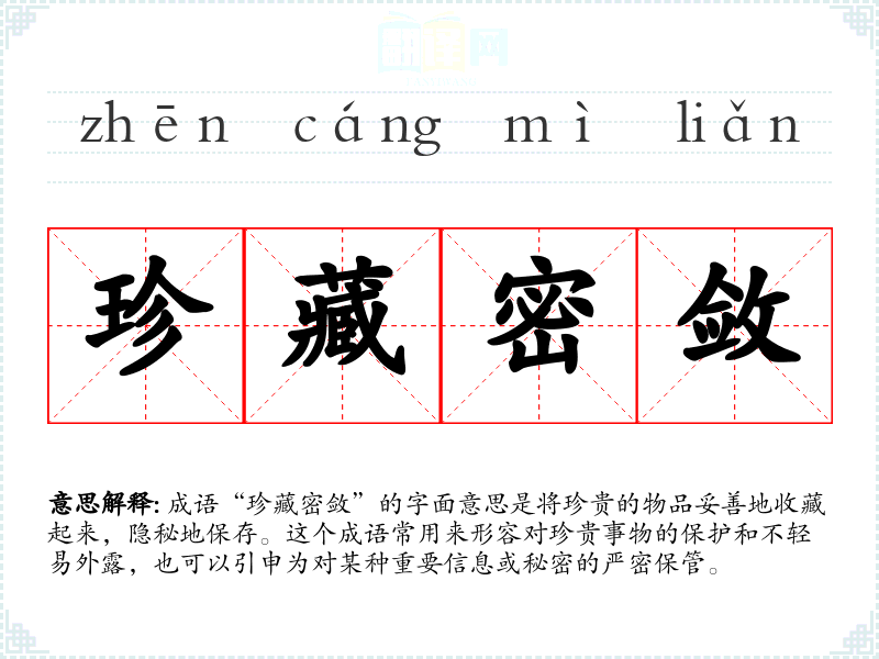 成语“珍藏密敛”的字面意思是将珍贵的物品妥善地收藏起来,隐秘地保存。这个成语常用来形容对珍贵事物的保护和不轻易外露,也可以引申为对某种重要信息或秘密的严密保管。