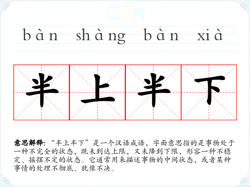 “半上半下”是一个汉语成语,字面意思指的是事物处于一种不完全的状态,既未到达上限,又未降到下限,形容一种不稳定、摇摆不定的状态。它通常用来描述事物的中间状态,或者某种事情的处理不彻底、犹豫不决。